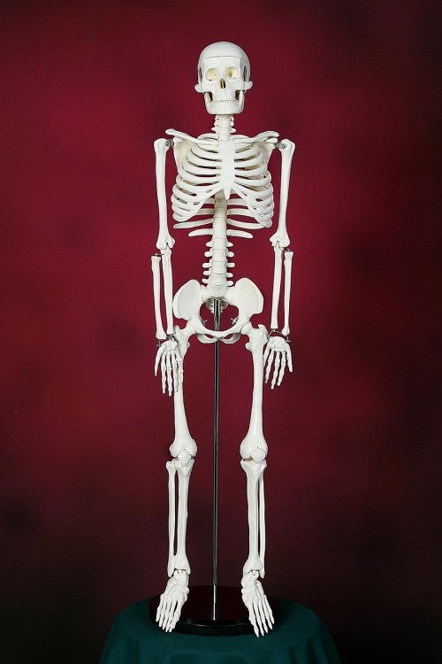 Кости выполнены в соответствии со строением скелета человека, и изготовлены из жесткого пластика белого (или светло-желтого) цвета. Крышка черепа съемная. Нижняя челюсть черепа подвижная, на пружинках. Верхние и нижние конечности легко съемные. Для сохранности при транспортировке конечности сняты. Скелету придана естественная поза стоящего человека. Позвоночник негнущийся. Ребра, тазовые кости и череп жестко соединены с позвоночником. Конечности присоединяются на шарнирах. Скелет устанавливается на хромированную стойку на пластиковой подставке