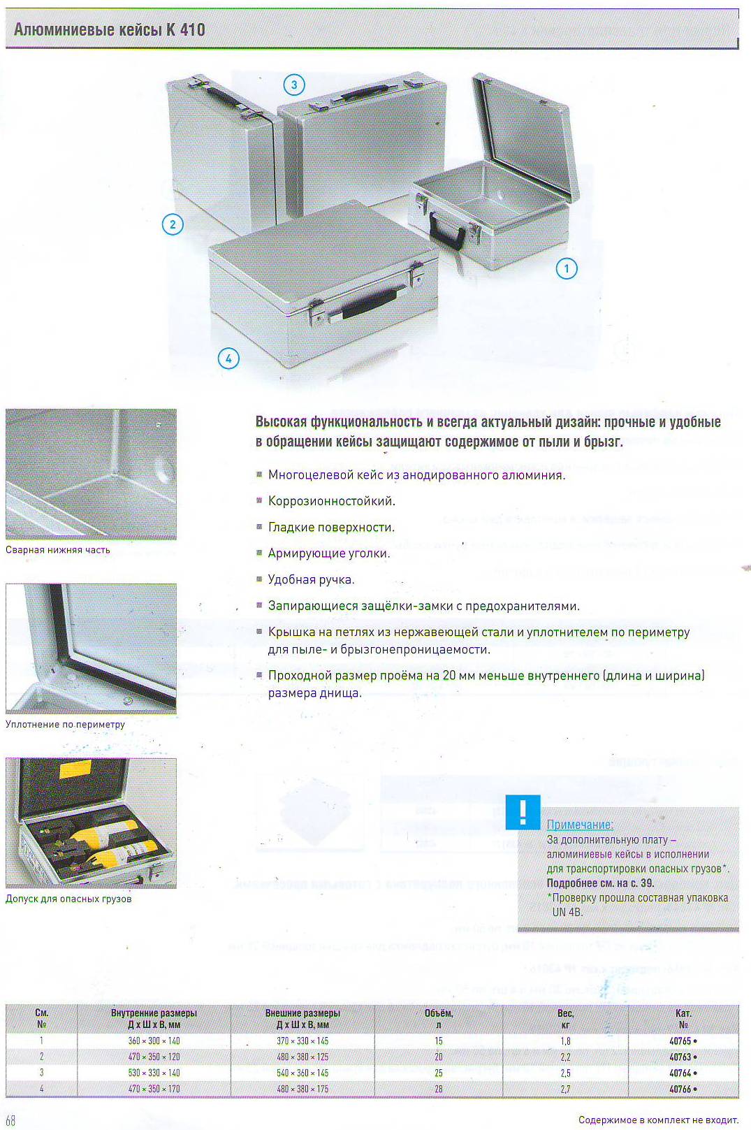 Кейс (кофр) алюминиевый (Германия). От 15 литров до 56 литров. Кейсы и кофры Zarges, такие же надежные как алюминиевые ящики, отлично подойдут для бережной транспортировки документов, различного рода приборов и оборудования. Кейсы выполнены из алюминия, что гарантирует им высокие прочностные характеристики и н… Читать дальшеебольшой вес, что особенно актуально при эксплуатации. Кофры и кейсы устойчивы к негативным воздействиям температуры, погодным осадкам, а также другим жидкостям и веществам, которые могут навредить транспортируемому грузу. Алюминиевые кейсы представлены в различных размерах, что позволяет подобрать кейс под конкретные нужды отдельного покупателя. Технические особенности алюминиевых кейсов Анодированная поверхность из алюминиевого сплава. Широкие стальные шарнирные петли на заклепках кейса. Противоударные планки из полимерного материала по всему периметру. Полиуретановый уплотнитель, обеспечивающий защиту кейса от пыли и влаги. Удобная ручка для переноски и 2 замка с предохранителями от самопроизвольного открывания кейса. Кофры дополнительно оснащаются кодовыми замками, тканевой обивкой внутри, отделениями и фиксаторами крышки. Кейс алюминиевый Zarges - стильный защитный аксессуар для любого делового человека, который ценит стиль, надежность и долговечность! Как дополнительное оснащение для алюминиевых кейсов: цифровой замок, атташе-вкладыш, фиксатор крышки кейса. Наше качество – Ваша безопасность Полный каталог продукции Царгес на: http://zarges-all.ru/order Россия, 620042, Екатеринбург, ул. Ломоносова, д. 55Б, офис 14, тел./факс: (343) 382-69-10, 381-59-97 www.kaiman.ru, www.zarges-all.ru, www.zarges.com/ru - сайт производителя. E-mail: ural@kaiman.ru