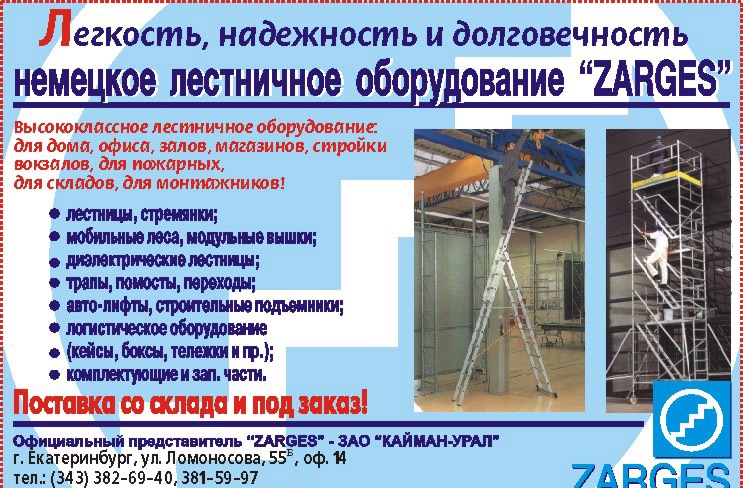 Стремянки, лестницы, подмости, вышки, боксы, кейсы для профессионалов (Германия). Компания ЗАО КАЙМАН предлагает Вашему вниманию высококлассное оборудование для работы на высоте – Zarges. Фирма Zarges (Германия) - крупнейший в Европе концерн по производству подъемной техники и логистических систем из легких с… Читать дальшеплавов, компания Zarges основана 06 июня 1933 года. Надежная и удобная лестничная техника Zarges проходит строжайший контроль качества и безопасности, представлена и отлично зарекомендовала себя в областях подъемной техники и логистики в 60 странах мира. Техника Zarges пользуется большой популярностью и в России. Широкий модельный ряд изделий – от стремянок до лесов и передовые технологии производства гарантируют высочайшее качество, безопасность и разнообразный спектр в области применения лестниц Zarges. Предпочтительным материалом для продукции Zarges является легкий металл алюминий. При этом используются разнообразные преимущества данного материала, такие как высокая устойчивость при одновременно малом весе, устойчивость к коррозии и погодным условиям, универсальность различного применения. Обширная производственная программа Zarges включает более 500 серийных изделий, но в отдельных случаях, когда это необходимо заказчику, Zarges находит индивидуальные решения специальных задач. Направление деятельности фирмы Zarges охватывает весь спектр профессиональных и специализированных задач потребителя во многих сферах промышленного производства и видов деятельности отдельного человека. В ассортименте фирмы Zarges: • Приставные лестницы • Стремянки одно и двухсторонние, безопасные лестницы и подставки • Раздвижные лестницы и лестницы на тросовой тяге телескопического типа • Многофункциональные лестницы • Системы мачтовых лестниц • Диэлектрические (приставные, двухсекционные, классические и симметричные) лестницы и стремянки • Лестницы для проведения специальных работ • Переходы, лестницы и подмости • Передвижные подмости • Мобильные, передвижные и складные вышки с рабочей высотой до 15 м • Лестницы для работы на крыше • Настенные эвакуационные лестницы • Тележки для транспортировки и хранения • Боксы • Кейсы • Кофры Наше качество – Ваша безопасность Полный каталог продукции Царгес на: http://zarges-all.ru/order Россия, 620042, Екатеринбург, ул. Ломоносова, д. 55 Б, офис 14, тел./факс: (343) 382-69-10, 381-59-97 www.kaiman.ru ; www.zarges-all.ru ; www.zarges.com/ru - сайт производителя. E-mail: ural@kaiman.ru